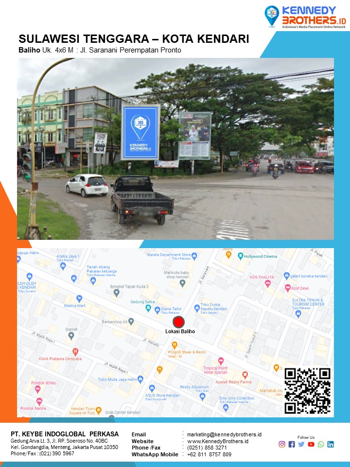 KennedyBrothers.ID adalah Platform Pencarian, Penyewaan dan Produksi Iklan Indoor-Outdoor Online Terbesar dan Terlengkap di Indonesia. Kini Pesan dan Sewa Billboard, Led/Videotron, Bando Jalan, Neonbox, Streetsign, Branding Mall, Branding Mobil, Branding Motor bisa dilakukan di KennedyBrothers,Id. Untuk mempercepat proses pemesanan dan transaksi lokasi media ini dapat menghubungi admin pada icon CS WhatsApp (Fast Respon) Pojok Kanan Bawah